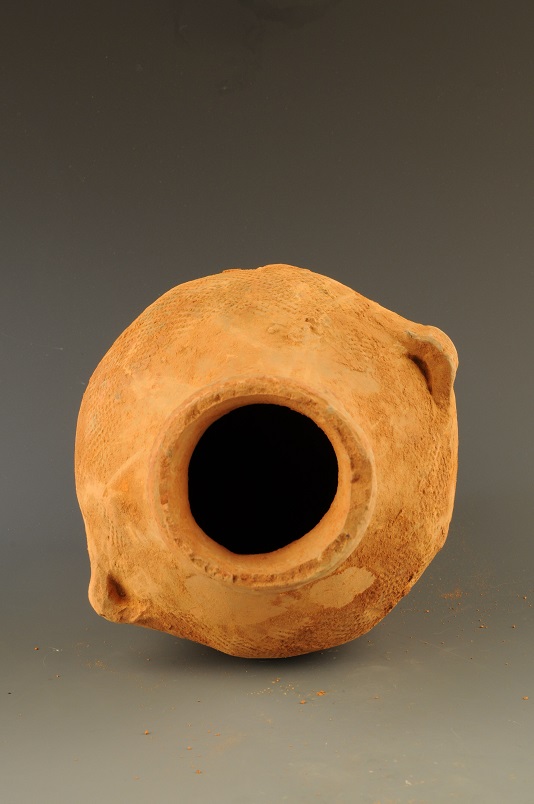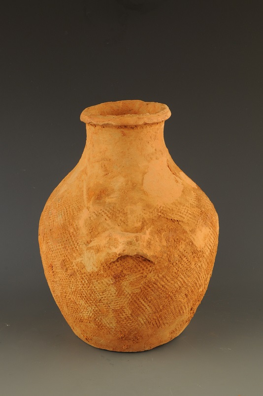 形态特征:侈口,长颈,溜肩,圆腹,平底。肩部对应各置一桥形系,腹部饰拍印的方格纹,胎质厚重,89年抚北镇东汉墓葬出土。