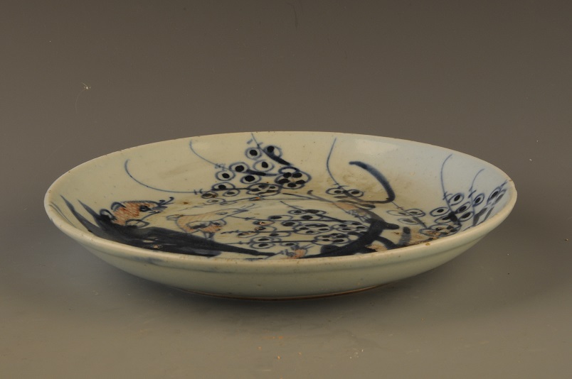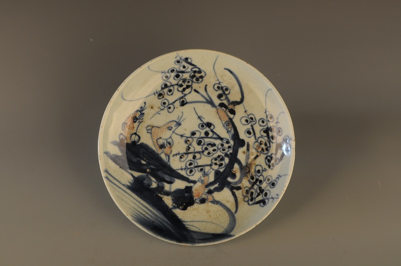 形态特征:敞口,弓形壁,圈足,盘内壁以青花釉里红花鸟为饰,盛开的梅花以及欢快的鹤构成了一幅绝美的图画,画意清新高雅。