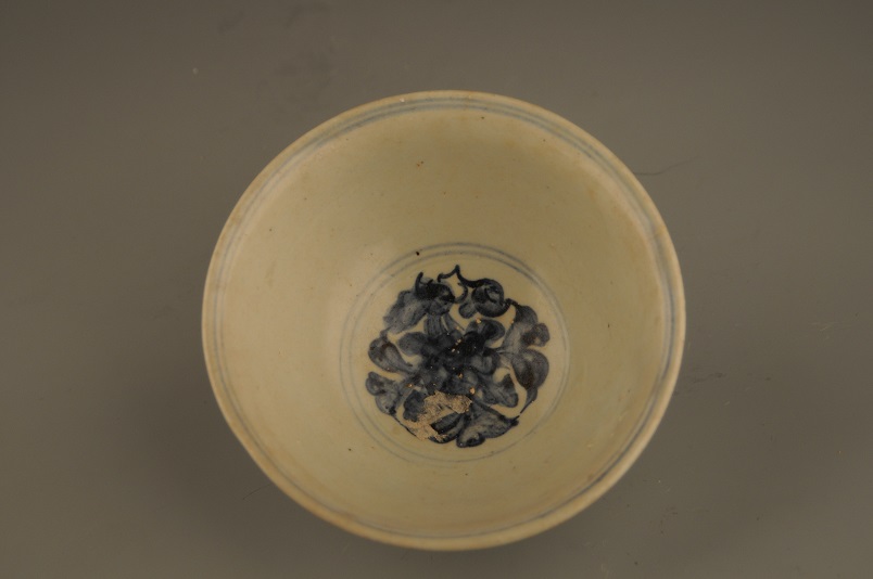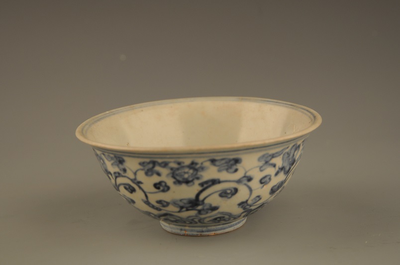 形态特征:撇口,浅腹,圈足,碗内外壁近口沿处绘二圈青花弦纹,碗内底双圈中绘青花缠枝莲一组,碗外壁满绘青花缠枝莲纹图案。