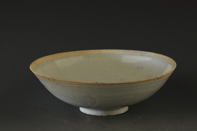 形态特征:芒口,弧壁,矮圈足,碗内壁满刻卷草纹饰,碗内外壁均施青白釉,口沿无釉。