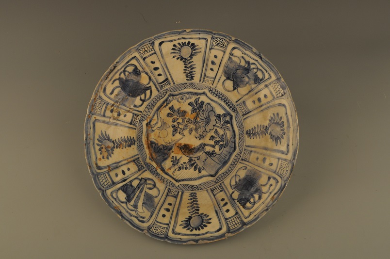 形态特征:葵花口,折沿,浅腹,平底,矮圈足,盘外壁为八开窗飞虫图案,盘内壁外区为八个莲瓣形开窗,窗内饰四吉祥和向日葵,两窗间以立柱