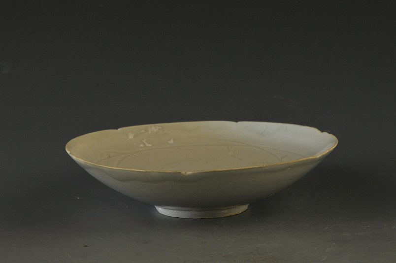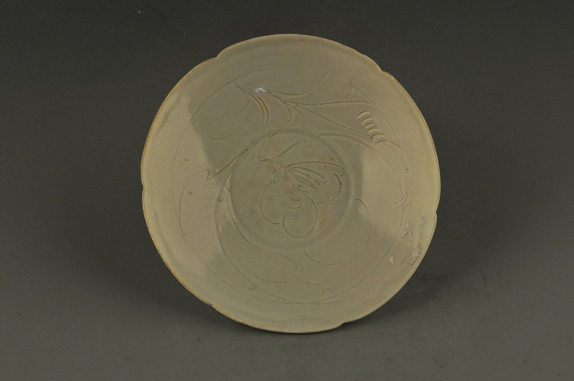 形态特征:葵口,浅弧壁,矮圈足,碗口平,碗内满刻卷草纹饰,通体施青白釉。