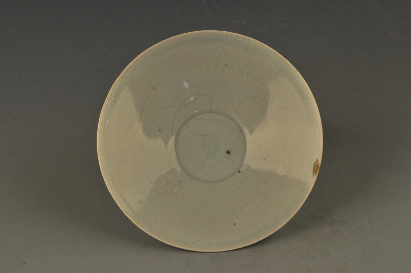 形态特征:敞口,浅弧壁,矮圈足,碗内满刻卷草纹饰,通体施青白釉。