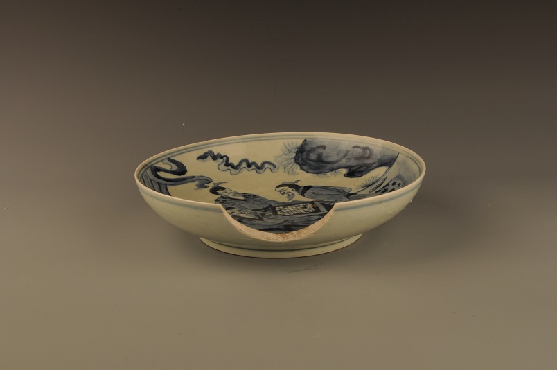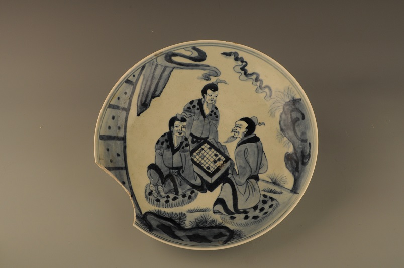 形态特征:敞口,弓形壁,盘内壁以青花为饰,边饰绘高山流水,盘内底绘三高士“弈棋图”,人物形象生动准确,盘底书大明嘉靖年制,口沿残破。