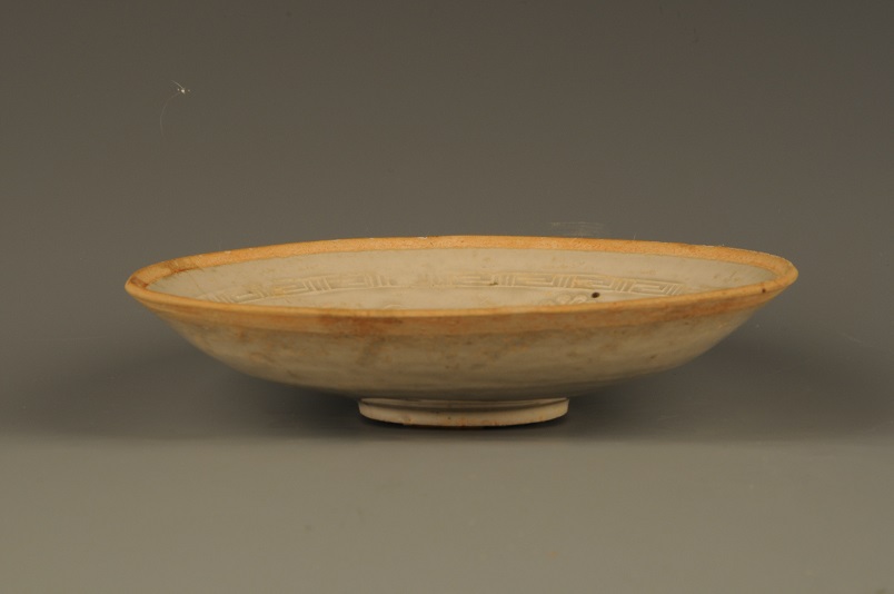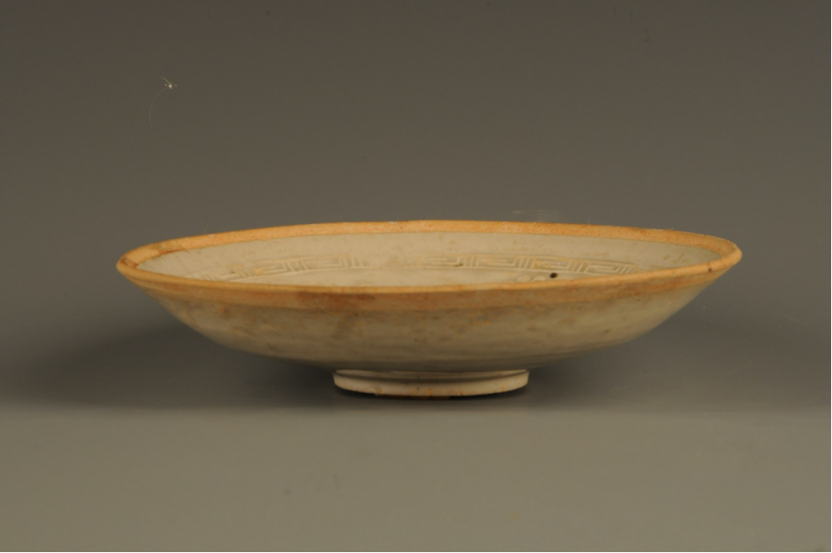 芒口,浅弧壁,圈足,碗内壁近口沿处模印一圈回纹,碗心模印菊花瓣纹,口沿无釉,通体施青白釉。