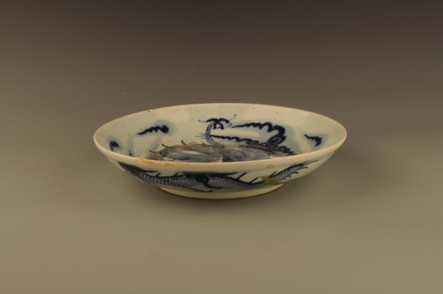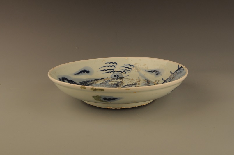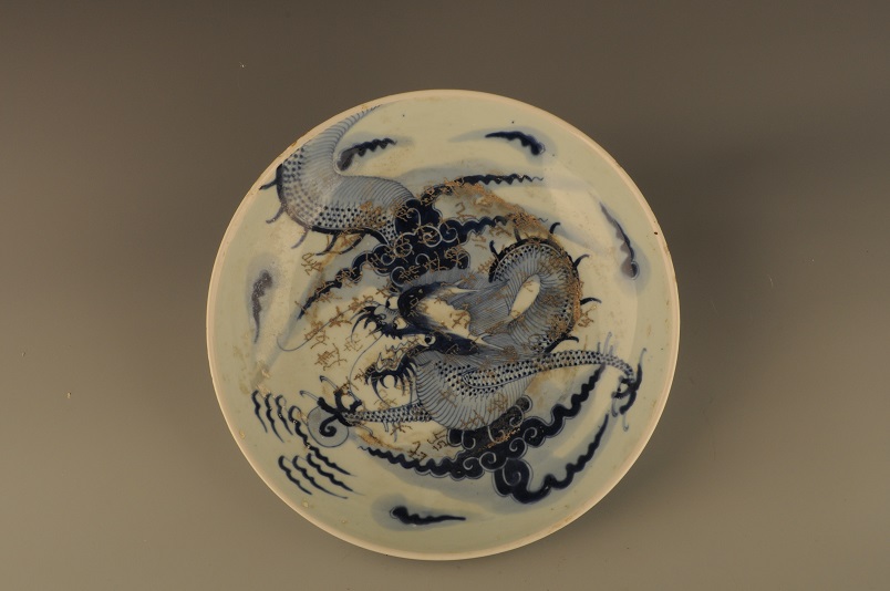 形态特征:敞口,弓形壁,圈足。盘心绘二龙盘踞,火焰状云纹围绕,龙爪伸展舒张,龙尾颈健,逐渐缩小,线条流畅,形态逼真。