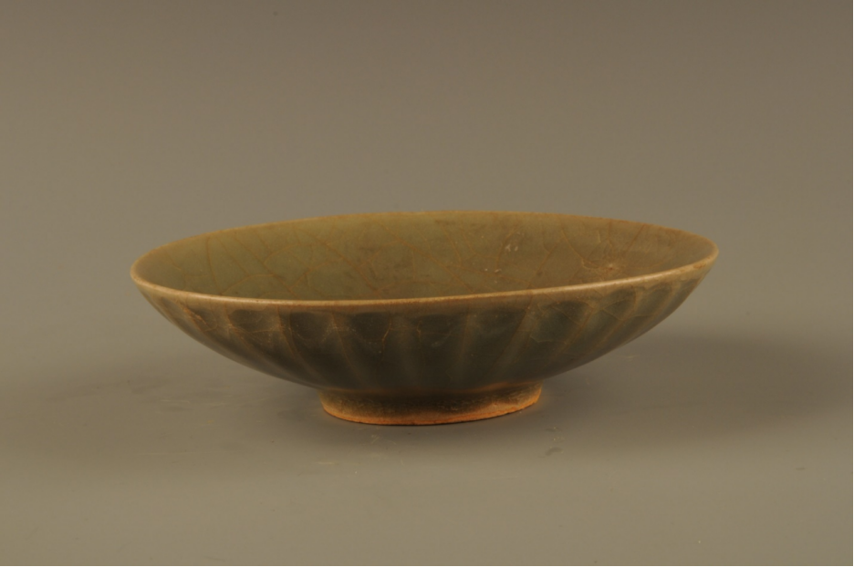 形态特征:敞口,斜壁,矮圈足,器内壁饰莲瓣纹,器身开冰裂纹,通体施青釉。