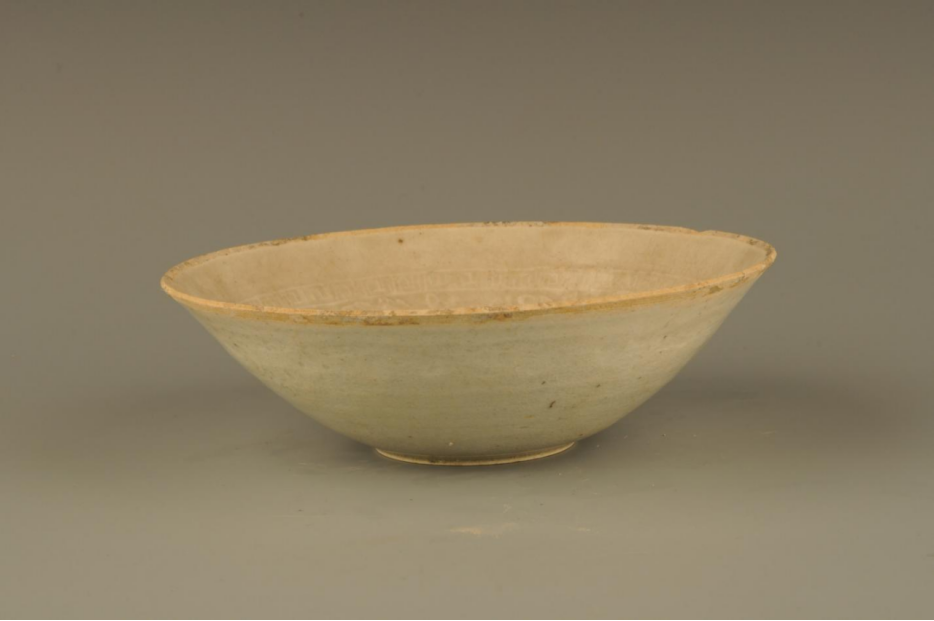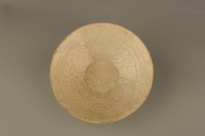 形态特征:敞口,斜壁,矮圈足,碗内壁印双凤,碗心模印莲瓣纹,口沿足底无釉,通体施青白釉。