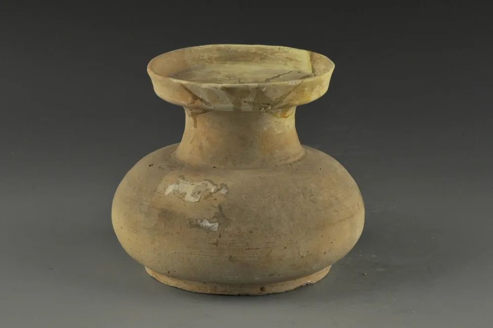 盘口, 短颈, 溜肩, 扁圆腹, 圈足, 整体造型端庄规整, 古朴典雅, 素胎。