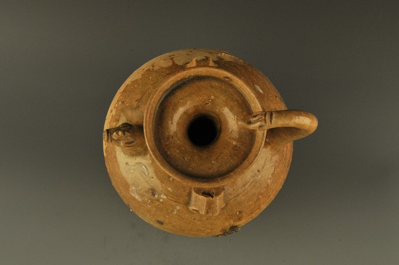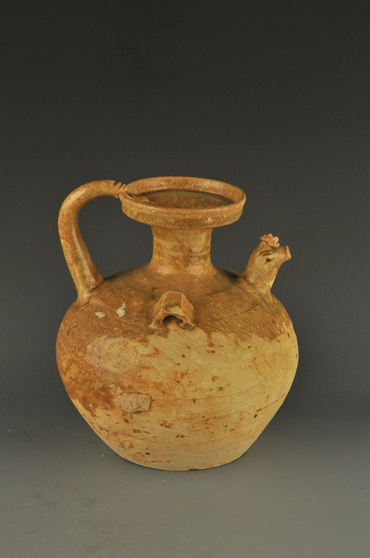 盘口, 壶嘴为鸡头, 口圆冠高, 柄呈鸡尾形, 与盘口相连, 并稍高于壶口, 细颈, 溜肩, 浑圆腹, 平底, 肩部安两个对应桥形系钮, 壶身施青釉, 釉汁泛黄, 釉不