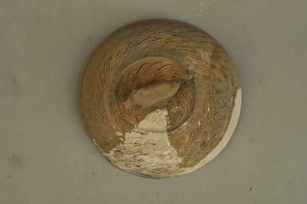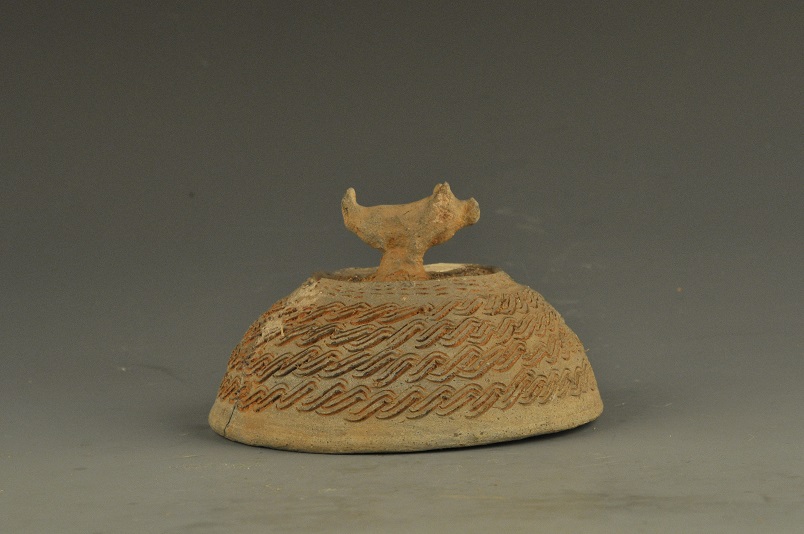 圆弧形外盖, 盖顶立一小陶猪, 盖身满饰S纹, 此盖应与罐连成一体, 但罐已失。