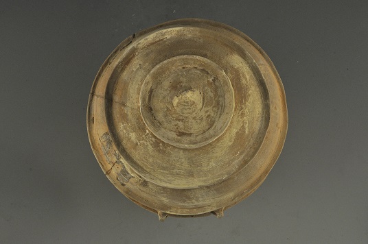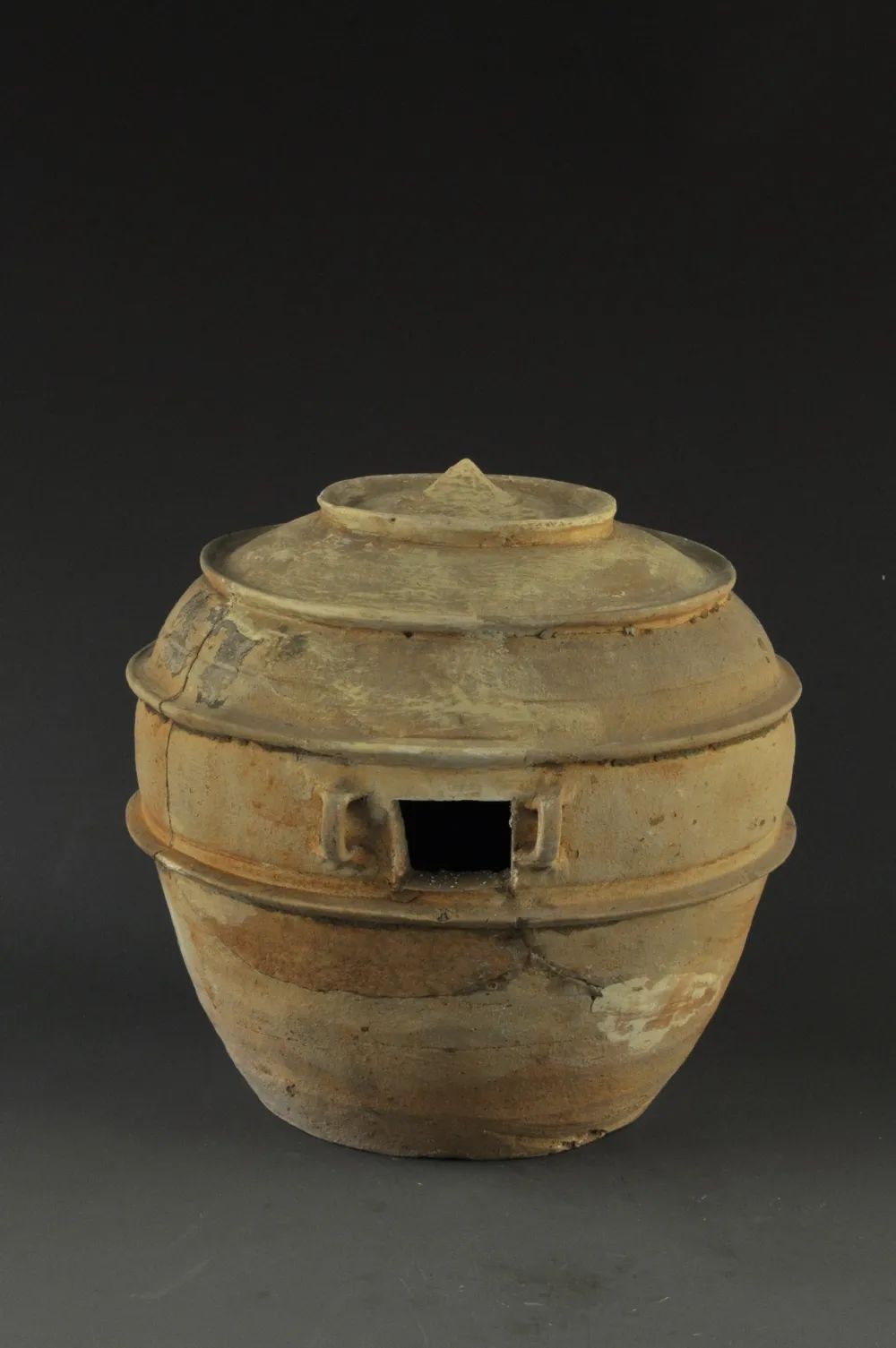 仓体近球形, 平底, 近顶部和腹部分置四周凸棱, 顶部成圆弧形, 圆肩封顶, 腹内空, 腹中部开一方形仓门, 门两侧对应各置一桥形系, 该仓造型别致。
