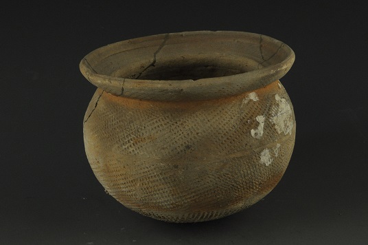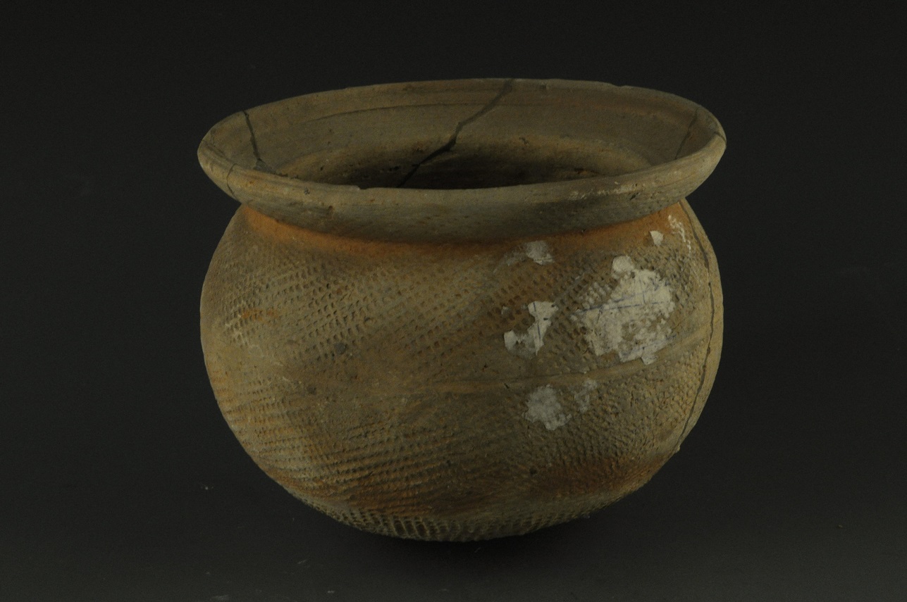 敛口, 深弧壁, 扁圆腹, 圆底。腹部饰一圈弦纹, 器身满饰拍印的网格纹, 灰陶质。 1987年抚北镇商代遗址中出土。