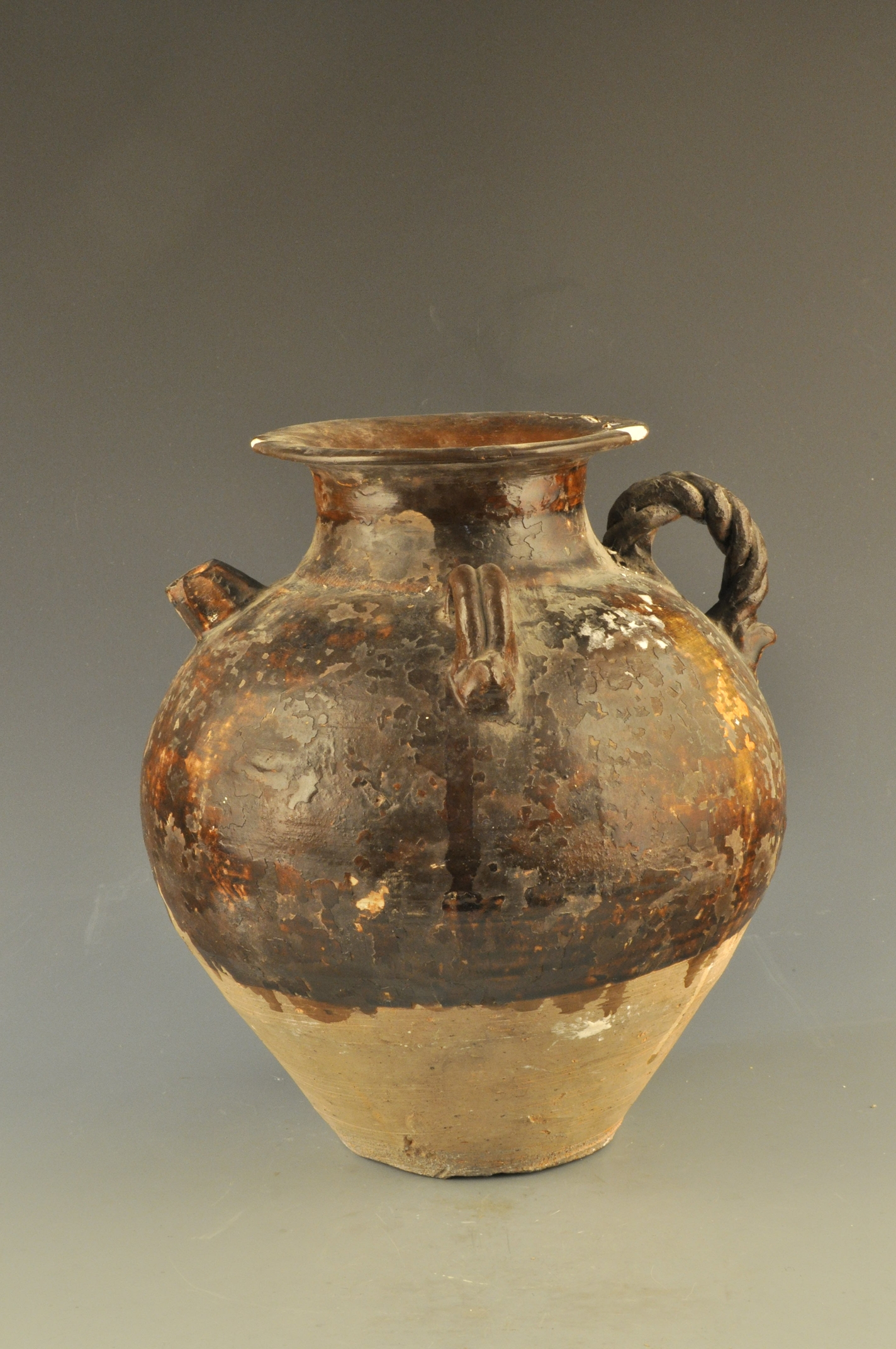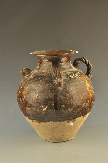 唐代褐釉麻花纽双系喇叭口壶喇叭口, 尖圆唇, 束颈, 溜肩, 鼓腹, 平底, 肩部对应各堆塑一环形麻花钮, 棱形流, 条形系, 器
