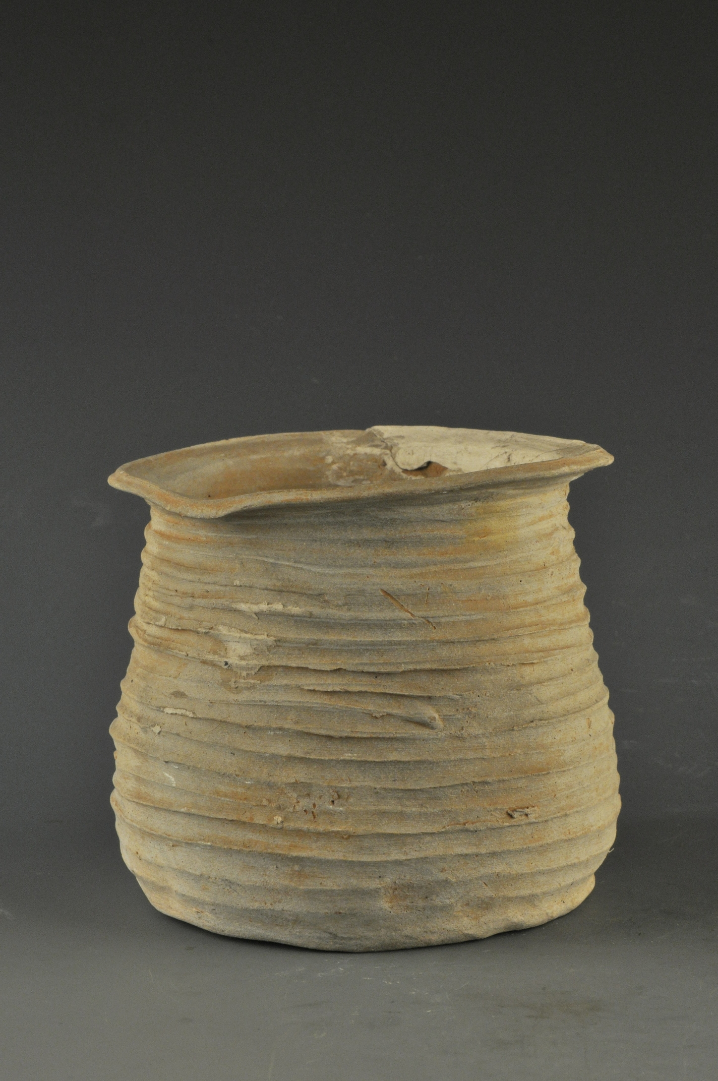 撇口, 平底, 近底腹微鼓, 器身饰多重弦纹, 灰陶质。1987年抚北镇商代遗址中出土。