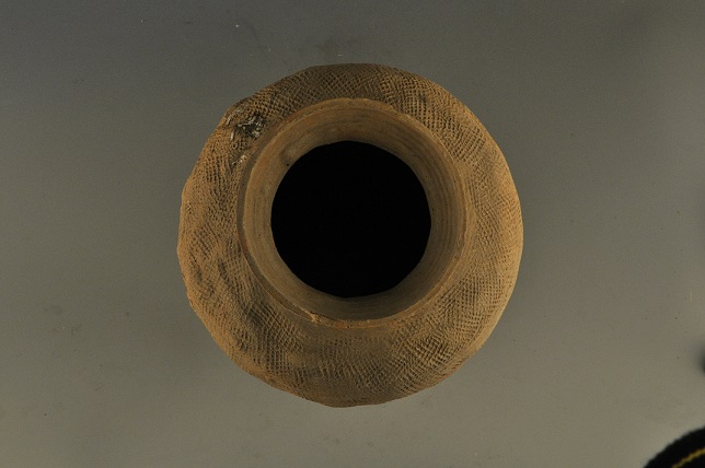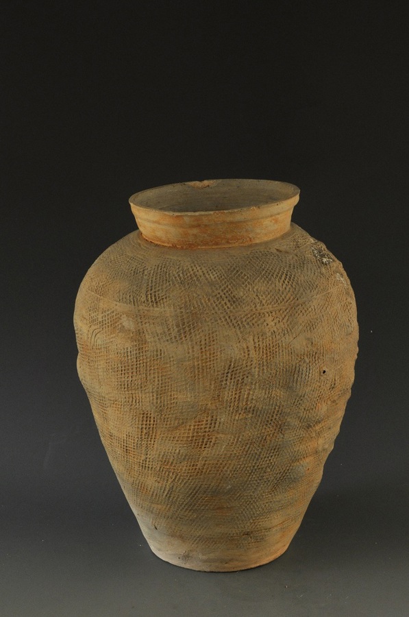 东汉网格纹侈口陶罐侈口, 丰肩, 平底, 长圆腹渐下收至底, 通体饰网格纹。