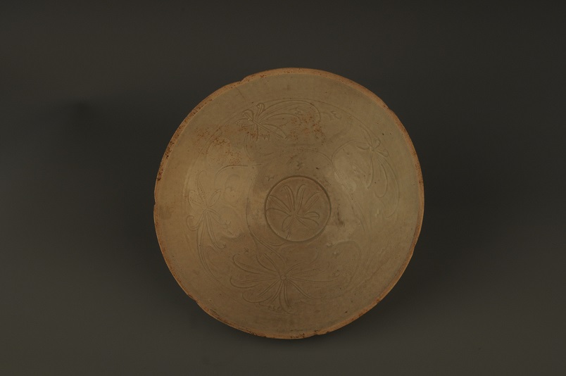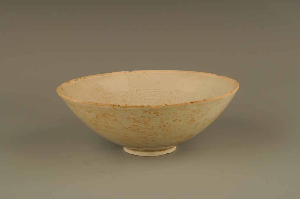 宋代青白釉刻划纹芒口碗敞口, 斜壁, 矮圈足, 碗内壁刻有花纹图案, 口沿无釉。