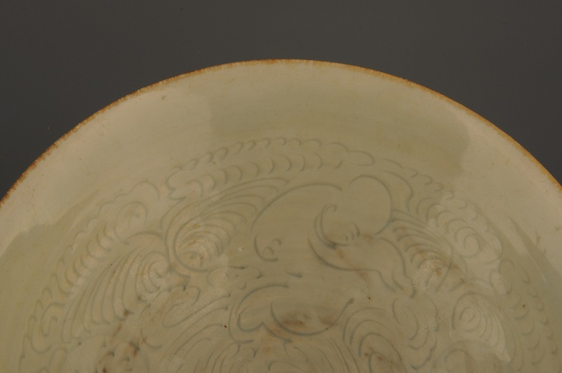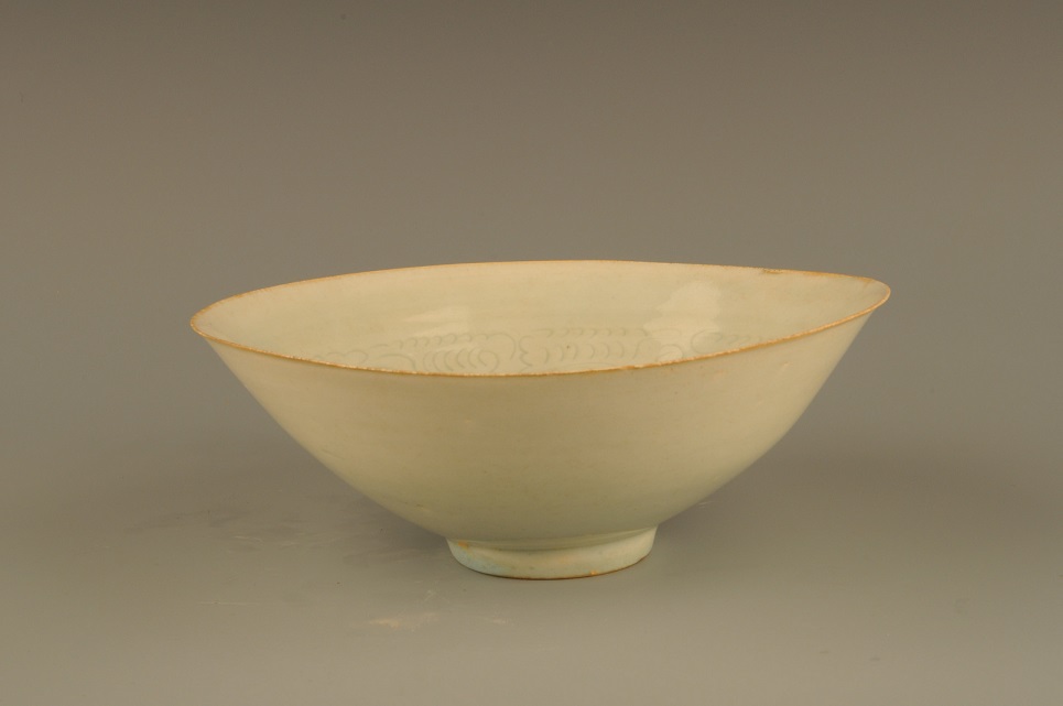 南宋青白釉刻划婴戏纹碗敞口, 斜壁, 斗笠状, 矮圈足, 碗内壁满刻婴戏纹饰, 通体施青白釉。