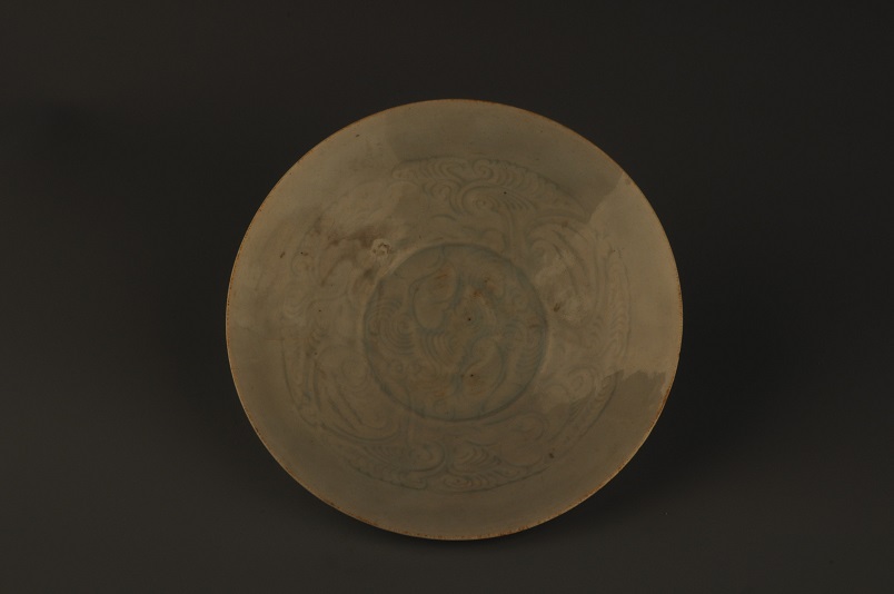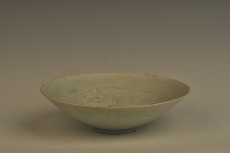 南宋青白釉刻划海水纹碗敞口、 斜壁、 矮圈足, 碗内壁刻有海涛纹饰, 足底无釉, 通体施青白釉。