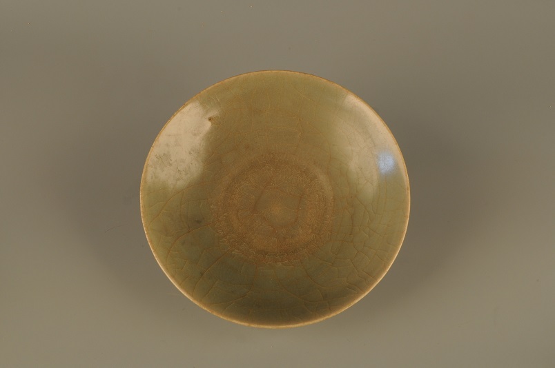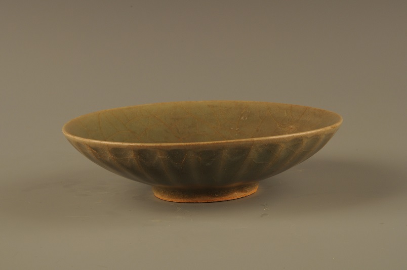 宋代青釉莲瓣纹碗敞口, 斜壁, 矮圈足, 器外壁施莲瓣纹, 器身开冰裂纹, 通体施青釉。