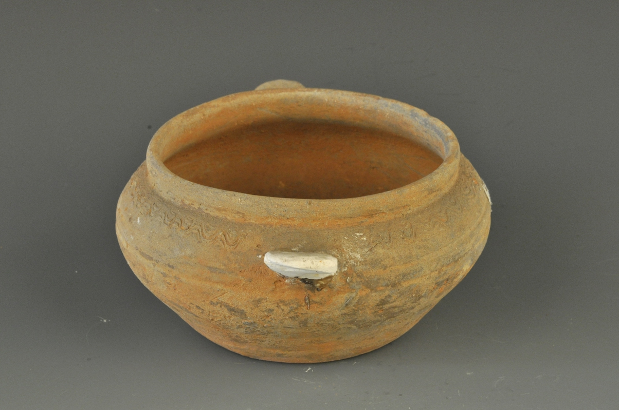 直口,扁圆腹,平底。肩部对应各安有一耳,并依稀可辨~纹,腹部饰一圈弦纹,素胎,胎质坚硬。